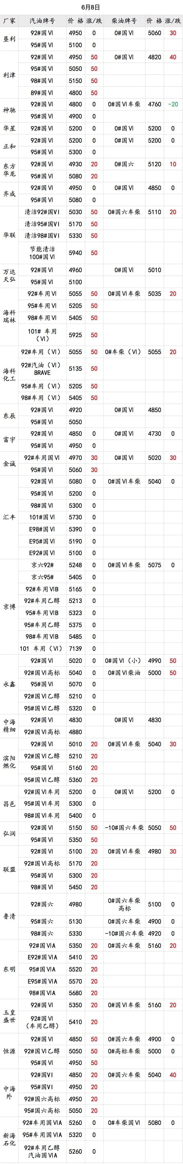 據卓創資訊測算,截至6月8日收盤,國內汽油均價為5707元/噸,較5月底上漲180元/噸,柴油均價為5433元/噸,較5月底上漲21元/噸。