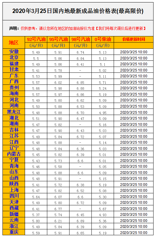 油價最新消息:今日2020年3月25日星期三,3月份第二輪,國內(nèi)成品油十個工作日計價周期已經(jīng)過去了一半,也就是油價倒計時了,數(shù)據(jù)顯示:截止國內(nèi)第六個工作日,綜合原油品種變化率為-29.98%,當前油價預測下調(diào)約1145元/噸,折成公升價約0.9元左右。調(diào)價詳細時間為2020年3月31日24時正式開啟,當前綜合原油均價低于40美元/桶,成品油零售限價將不作調(diào)整。